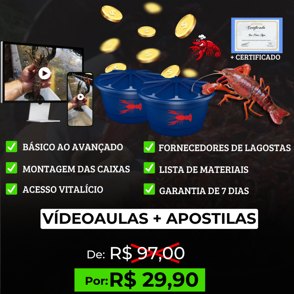 Com nossa orientação passo a passo e o suporte de nossa equipe especializada, você poderá montar seu tanque e começar a criar lagostim em questão de dias. Não perca essa oportunidade de trabalhar em casa e gerar um rendimento mensal recorrente.